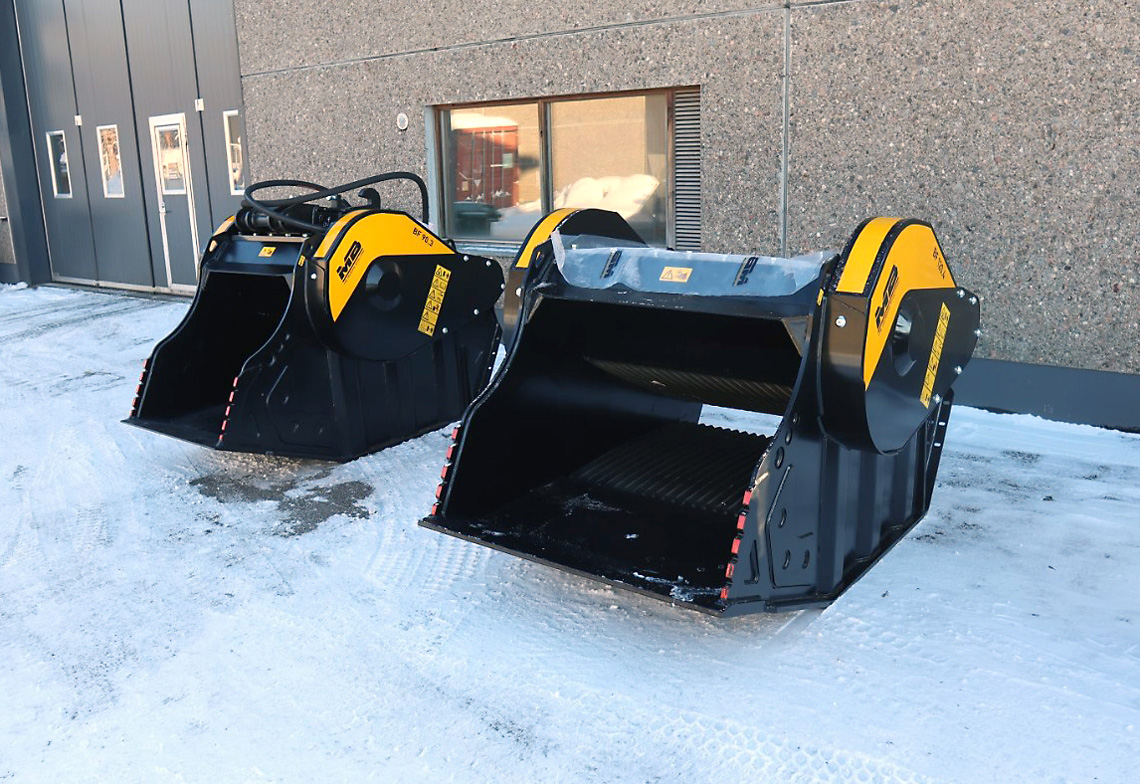 Vasemmalla BF 90.3- ja oikealla BF 120.4 -murskauskauha. Molemmat ovat betonin murskaukseen tarkoitettuja leukamurskaintyyppisiä lisälaitteita kaivukonekäyttöön.